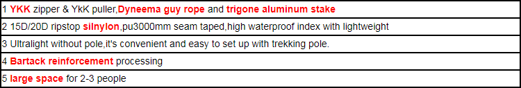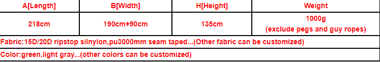 Place of Origin: Jiangsu, China Brand Name: MYWAY Color: light gray or customization Tent Style: Extended Type Season: Four-season Tent Structure: One Bedroom Building Type: Quick Automatic Opening Bottom Waterproof Index: >3000 Mm Outside Tent Waterproof Index: >3000 Mm | Product name: Ultralight Backpacking Outdoor Camping Tent Usage: Outdoor;Camping;Hiking;Travelling Feature: Quick Automatic Opening,Water Proof, rainproof and windproof;Ultralight Material: 20D silnylon Size: 218x(190+90)x135cm Weight: 2kg MOQ: 1 Piece PACKING SIZE: 40X15X10 cm Floor: 210D Oxford cloth Package: 1pcs/Nylon Bag