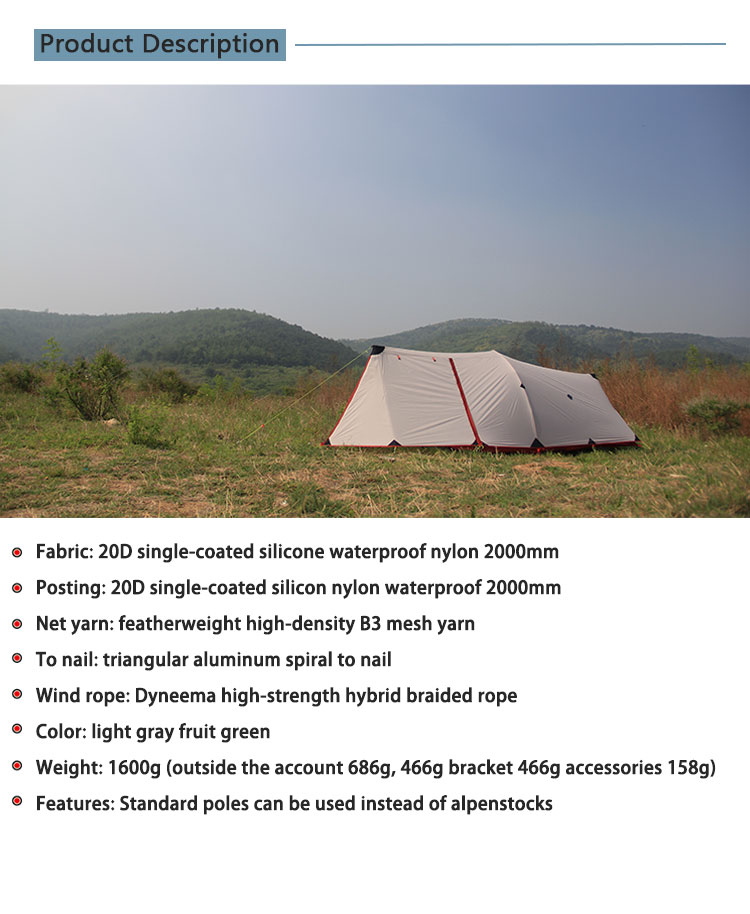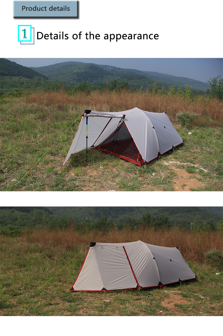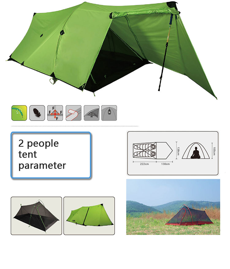 Ultralight 2 Person Camping Tent Outdoor Usage: Outdoor Camping Hiking Travelling Feature: Quick Automatic Opening,Water Proof, rainproof and windproof,Ultralight Pole: Aluminium Alloy Material: 20D R/S nylon Size: 138*(222+130)*105cm Weight: 3.2kg MOQ: 1 Piece Floor: 210D Oxford cloth